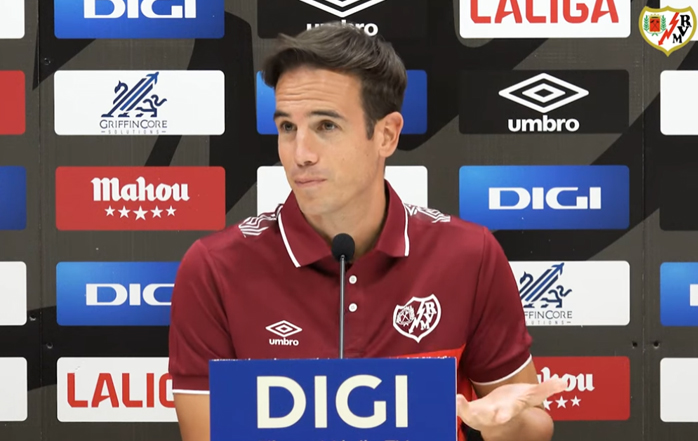 "No, no me esperaba de aquí al jueves para tener un ataque de sinceridad, pero le preguntaré a ver si es verdad que siente esto y ahora fuera bromas, entiendo, los jugadores al final juegan muchas veces a ser entrenadores, se dejan guiar un poco por lo que leen, por lo que ven, pero yo siempre lo he dicho, tengo varios delanteros, varios jugadores de ataque que pueden jugar en la posición más centrada en vez de por fuera y el mercado nos dirá, o la gente que está en el club que se dedica a esto nos dirá si hacemos a alguien más o nos quedamos como estamos. Mi equipo es el Numancia, además ahora mismo no está en la liga, así que lo puedo decir abiertamente, si dijese que mi equipo es otro de los que está en la liga, de los que, bueno, sabéis que tengo ciertos vínculos o he jugado o he nacido allí o tal, pues se generaría polémica, no, mi equipo es el Rayo porque es mi club y el Numancia. El Numancia, a ver, yo siempre que hablo de Soria podría estar aquí hablando media hora, pero tengo muchos lazos personales, fue una etapa preciosa en mi vida que me ayudó mucho en una fase difícil, entonces, bueno, he generado mucho amor, mucho cariño por la provincia y evidentemente que sigo al equipo y ojalá dentro de poco podamos estar aquí en sala de prensa y que no pueda decir que mi equipo es el Numancia. Y después me has preguntado por... Para mí merecen jugar la final de Champions y la liga arrollan y tal, entonces siguen haciendo la misma línea, sabemos todos los equipos que tienen que hacer, pero al final acabamos cayendo en la trampa del fuera de juego y cuando no caes en la trampa del fuera de juego, como están tan altos, como decía antes Jonay, si no me equivoco, te roban y como tú has intentado romper esa línea te has desprotegido y te hacen mucho daño en la transición. Entonces, como le decía antes, todo va unido, mañana no podemos decir, no, en fase ofensiva esto, en fase defensiva los dos equipos, salvando las distancias, ojalá que se acorten, pero tenemos una idea similar de atacar y de defender, entonces el equipo que sea primero más certero, más pegada, que si tenemos que ir ahí a los puntos, pues normalmente perderemos, pero si somos capaces de contrarrestar esa línea y que ellos no nos dañen cuando nos roben, pues bueno, estaremos cerca de los escenarios del año pasado. Y ojalá podamos conseguir una victoria contra este equipo ya."