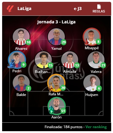 El once ganador estuvo formado por Aarón Escandell (51 puntos) en la portería, reforzado con un ítem que multiplicó su rendimiento. En defensa, Huijsen (6), Balde (2) y Rafa Marín (20) —también potenciado— aportaron solidez y equilibrio. En el centro del campo, brillaron Pedri (9) con ítem activado, Buchanan (15), Almada (13) y Valera (21), sumando protagonismo. Arriba, el tridente ofensivo fue decisivo: Mbappé (8) no pudo deslumbrar con su ítem, pero sí Yamal (29) y Alvarez (10).