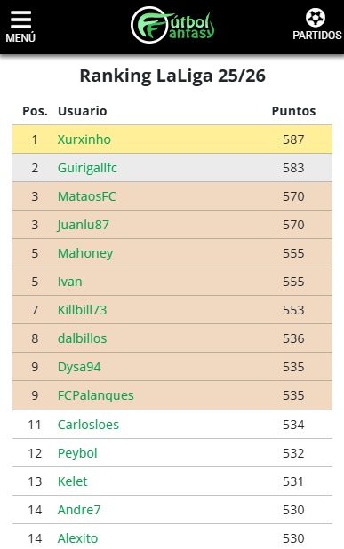 En el ranking general de LaLiga 25/26, se coloca primero Xurxinho, con 587 puntos, muy seguido de Guirigallfc, MataosFC y Juanlu87.