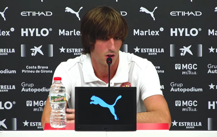 "Bueno, yo creo que se ha hablado mucho de rescindir, pero en ningún momento creo que el Tottenham se lo había planteado y es por eso que hemos llegado el último día. Si no hubiésemos rescindido a 1º de julio ya estaríamos todos más tranquilos y estaría aquí desde julio. Y nada, en cuanto al cambio de proyecto, al final no es lo mismo venir cedido, es cierto que el año pasado pues bueno, creo que individualmente y colectivamente no acabamos de la mejor manera, pero que estuve a un buen nivel futbolístico y creo que eso ha hecho que el club me diese la confianza de venir en propiedad, que para mí es muy importante pertenecer a un proyecto a largo plazo ya que llevaba 4 o 5 años en cesiones, que es complicado también para un jugador tan joven cambiar tanto de aire, de equipo, de sistema, y yo creo que lo que necesitaba era esa estabilidad y estoy muy agradecido al Girona porque me lo ha ofrecido."