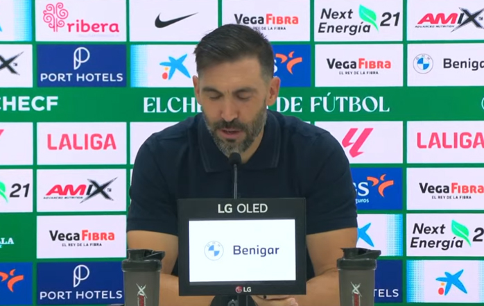 “Fíjate que Rodri está madurando en muchas cosas y una de esas cosas es, bueno, que se está sintiendo cada vez más importante, que cada vez se expresa dentro y fuera del campo. Y el otro día me mandó un mensaje al de poco de acabar el partido. Me dice: míster, he jugado 89 minutos, pero estoy a tope. El jueves estoy ahí, entreno lo que haga falta y para lo que tú necesites. Y, bueno, es la energía de un chico joven con la ilusión, con que se ve que está al nivel de poder jugar en primera división y de rendir mucho. Igual el año pasado jugó menos de lo que pensaba porque también tenía mucha competencia, pero seguramente todo lo que vivió el año pasado le ha servido para dar el nivel que está dando ahora. Entonces, bueno, veremos hoy cómo viene, cómo está, cómo puede hacer el entrenamiento y, a partir de ahí, decidiremos. Tenemos también otras alternativas. Puedo jugar de inicio, puedo entrar en el banquillo. Todavía, la verdad, que hay cosas que no he decidido de cara a mañana y que quiero hoy en el último entrenamiento, pues acabar de ver y de sentir un poco. Iñaki preparadísimo, Héctor también preparadísimo. Ha hecho un entrenamiento el día que llegó, ya quería moverse y quería, de hecho, también me intercambiaron algunos mensajes. Y, a pesar de estar con la selección y estar enfocado allí, pues transmitía mucho la ilusión de estar con nosotros y de querer ya formar parte del grupo y jugar y aportar. También preparadísimo, ha hecho dos o tres entrenamientos con el grupo. Grady, pues lo que os he dicho, que está preparado, pero es verdad que seguramente todavía no le vamos a ver en su mejor nivel. Adri Pedrosa creo que también muy preparado y, bueno, eso con un poco de las llegadas últimas, no sé si me dejo alguno. Y de lo demás, los lesionados, realmente el único que va a ser baja será Marc Aguado, porque se hizo un poquito de daño en el último partido de Liga, por eso tampoco jugó el otro día en Murcia. Lo estamos cuidando; si fueran otras circunstancias y si fuera por él, mañana jugaría, pero es verdad que entendemos que tenemos que ser un poquito más conservadores y luego, aparte, casi quedan nueve días para el siguiente partido, diez días para el partido del Oviedo, entonces entendemos que es lo más inteligente. Y luego, Yago. Por lo demás, Pedro y David, fue un poco como era, entrenamiento regenerativo, preferimos que no salieran al campo para evitar impacto, pero están perfectos. Y no sé, alguno más, Álvaro, que es verdad que no entrenó, en principio yo creo que anteayer, yo creo que sí, hoy yo creo que entrenará todo y está bien y estará, yo creo, que 100%. Bueno, eso, en principio creo que esas dos bajas principalmente. Estamos recuperando a Adam también, veremos si hoy también completa, pues quizá también pueda ir convocado, o sea que, bueno, vamos a ver, pero en principio poco: gestión de cargas también; semana pasada también fue intensa con entrenamientos con el partido de Murcia, en el que no llegamos seguramente con la mayor de las frescuras, y que también, como hablamos el otro día, nos sirve para seguir mirándonos dentro, seguir aprendiendo, saber que todavía tenemos mucho margen de mejora y ese toque de atención que dijimos que quizá la temporada pasada fue en un partido de competición como Zaragoza, pues esta temporada igual nos ha venido en Murcia, y mejor que sea en un partido que no sea de competición, pero que evidentemente hay cosas que debemos poner y debemos poner nuestro 100%, porque si no en esta liga, pues todas esas buenas sensaciones que estamos transmitiendo se pueden ir por tierra enseguida. Entonces también nos sirve como un toque de aprendizaje, de humildad, y así lo hemos tomado y, como digo, creo que, salvo eso, salvo Marc y salvo Yago, los demás creo que preparados.”