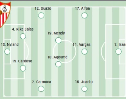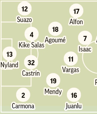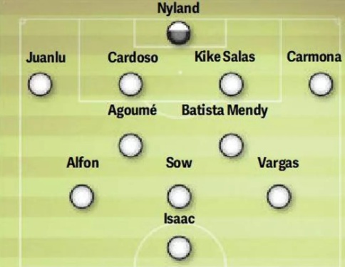 Nyland; Carmona, Azpilicueta, Kike Salas, Suazo o Castrín; Mendy, Agoumé; Juanlu, Vargas, Alfon; Romero