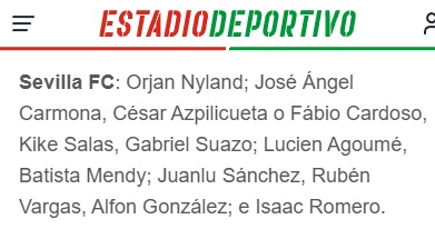 El conjunto sevillista llega al encuentro con varias bajas sensibles. Joan Jordán está fuera del césped hasta octubre debido a una hernia discal dorsal, mientras que Tanguy Nianzou y Akor Adams son baja por lesiones en el recto anterior y en el aductor, respectivamente. Además, Chidera Ejuke es duda para este partido por molestias en los isquiotibiales.