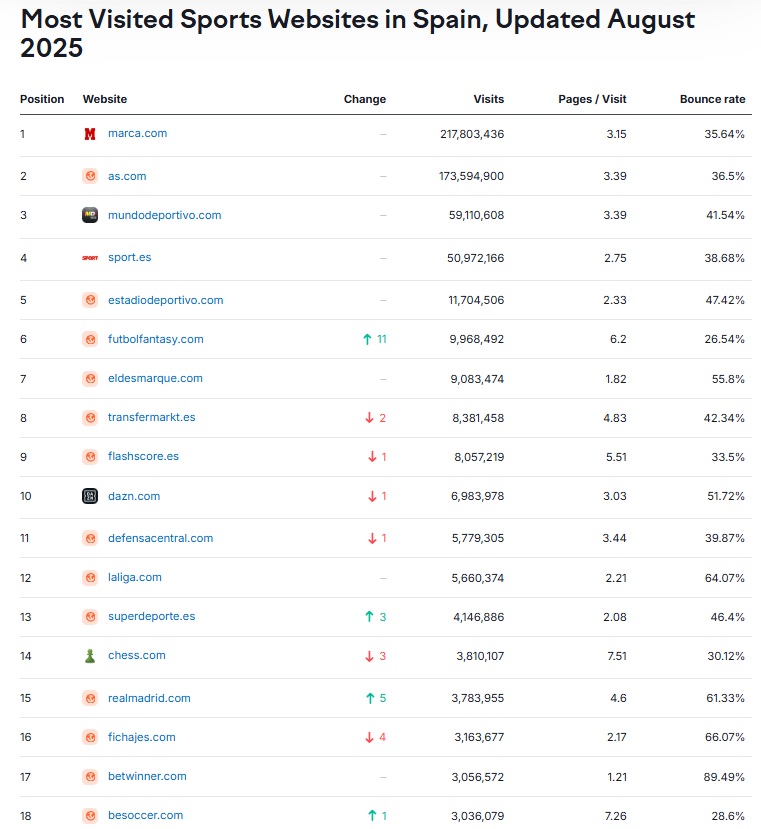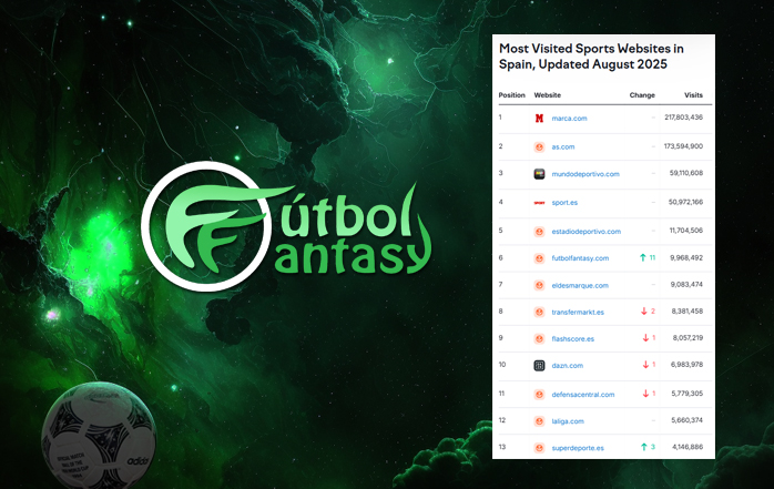 FutbolFantasy celebra un nuevo hito histórico en su trayectoria al situarse en el sexto puesto del ranking de páginas deportivas más visitadas en España. Este logro coloca nuestro proyecto por delante de gigantes internacionales como Transfermarkt o Flashscore, y a la altura de medios como Estadio Deportivo o El Desmarque.