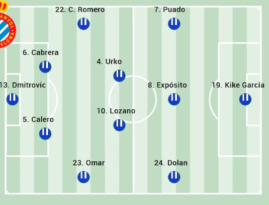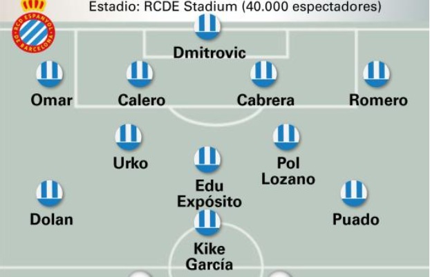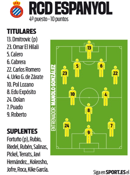El conjunto de Manolo González llega en un momento de forma notable, con un balance de 3 victorias, un empate y una derrota en su último partido a domicilio frente al Real Madrid. Con 10 puntos de 15 posibles, el Espanyol aspira a consolidarse en la zona alta de la clasificación. Para este encuentro, el equipo no presenta lesionados, aunque sí estará pendiente de Cabrera, que no completó la sesión del lunes y contará con la ausencia de Pere Milla, sancionado tras la expulsión frente al Mallorca.