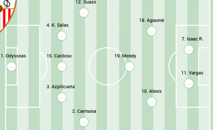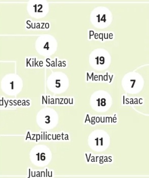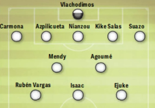 Vlachodimos; Carmona, Azpilicueta, Nianzou o Cardoso, Marcao o Kike Salas, Suazo; Mendy, Agoumé; Ejuke o Vargas, Alexis o Ejuke; Romero