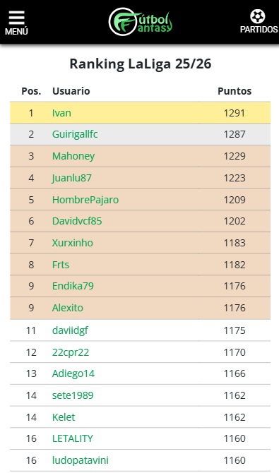 En cuanto al ranking general de LaLiga 25/26, el liderato se mantiene en manos de Ivan, que suma ya 1291 puntos tras ocho jornadas disputadas. Muy de cerca le sigue GuirigallFC, con 1287 puntos, mientras que el tercer lugar es para Mahoney, con 1229. La pelea en la zona alta está más ajustada que nunca y promete emociones fuertes de cara a las próximas semanas.