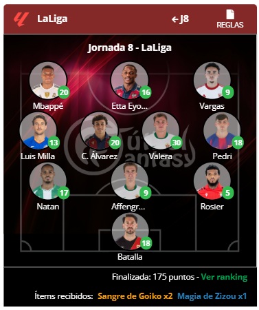 El Fantasy RPG de FútbolFantasy ya tiene a un nuevo vencedor en la jornada 8 de LaLiga. El usuario Samuel9 se ha proclamado campeón con un total de 175 puntos, gracias a una alineación repleta de aciertos.