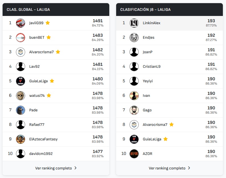 ¡LinkinAlex gana la jornada 8 y JaviiG99 se mantiene líder del ranking de LaLiga y del global de Predicted11.com!
