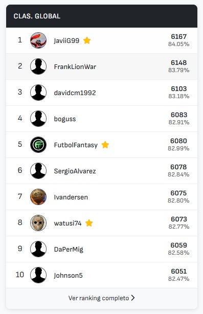 La clasificación global de LaLiga mantiene toda su emoción, con JaviiG99 conservando el liderato gracias a su regularidad y a un total de 1491 aciertos acumulados. Además, en el ranking global —que suma todas las competiciones cubiertas por Predicted11 (LaLiga, Premier League, Serie A, Segunda División y Champions League)— el mismo usuario también se erige como líder destacado con 6167 aciertos, demostrando su constancia y dominio a lo largo de múltiples torneos.