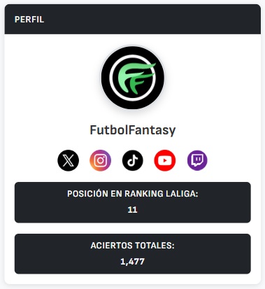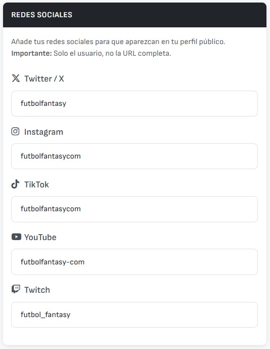 La nueva funcionalidad permite añadir los usuarios de Twitter/X, Instagram, TikTok, YouTube y Twitch desde la propia edición del perfil, quedando visibles para todos los visitantes. De esta forma, los expertos y creadores de contenido que participan en Predicted11 tendrán una nueva vía para difundir sus conocimientos, crecer en seguidores y consolidar su presencia digital dentro de nuestro ecosistema fantasy, potenciando así nuestra fiel comunidad.