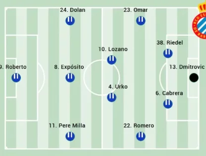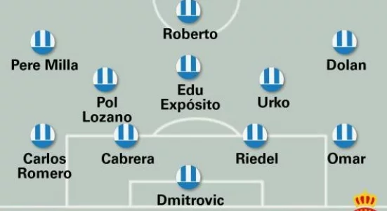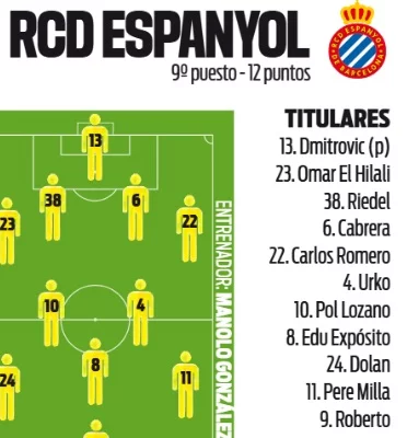 Dmitrovic; Omar El Hilali, Cabrera, Riedel, Romero; Urko González, Edu Expósito, Pol Lozano; Dolan, Pere Milla y Roberto o Kike García.