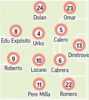 Dmitrovic; Omar, Riedel, Cabrera, Carlos Romero; Urko, Lozano; Dolan, Expósito, Pere Milla; y Roberto