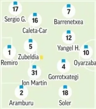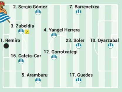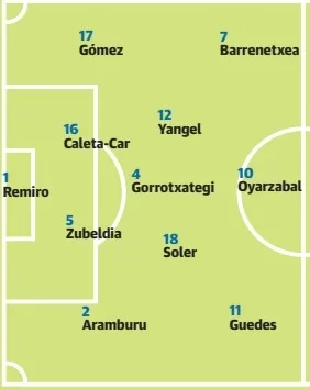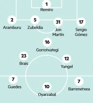En la medular, Gorrotxategi se ha ganado un lugar fijo como eje del equilibrio, acompañado por Herrera y Carlos Soler, aunque Brais Méndez también se encuentra en la pelea por mantener el sitio. En ataque, Oyarzabal es el líder indiscutible, mientras que Barrenetxea y Guedes apuntan a ocupar las bandas. El portugués, autor de un gol y una asistencia saliendo desde el banquillo ante el Celta, ha reabierto el debate y podría ser la gran novedad.