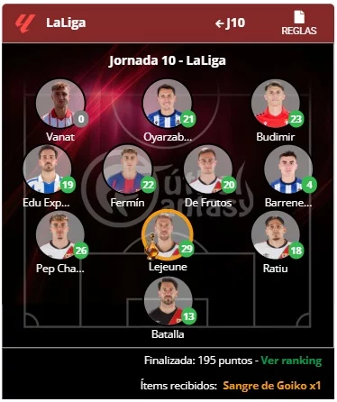El Fantasy RPG de FútbolFantasy ya tiene al vencedor de la jornada 10 de LaLiga. El usuario Arfonso1988 se ha proclamado campeón con un total de 195 puntos, gracias a una alineación repleta de aciertos.