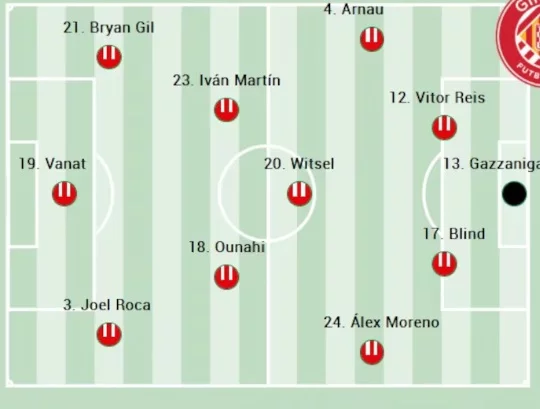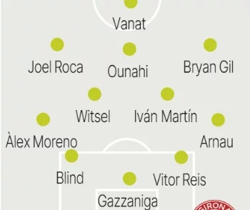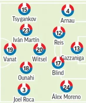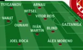 En cuanto al once titular, se esperan futbolistas que descansaron en Copa como Gazzaniga, Arnau, Álex Moreno, Witsel, Ounahi, Iván Martín, Vanat y Roca. Rincón completará la defensa si Blind no llega al cien por cien, mientras que Tsygankov, Bryan Gil y Lemar se disputan la última plaza en la zona de tres cuartos.
