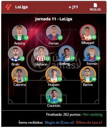 El Fantasy RPG de FútbolFantasy ya tiene al vencedor de la jornada 11 de LaLiga. El usuario alen9 se ha proclamado campeón con un total de 262 puntos, gracias a una alineación repleta de aciertos.
