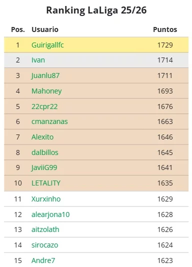 En cuanto al ranking general de LaLiga 25/26, el liderato sigue siendo para GuirigallFC, con 1729 puntos. Muy de cerca le siguen Ivan y Juanlu87, con 1714 y 1711 respectivamente. La pelea en la zona alta está más ajustada que nunca y promete emociones fuertes de cara a las próximas semanas.
