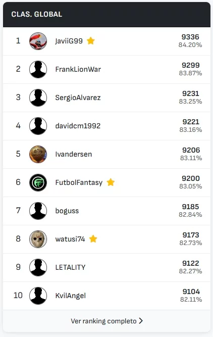 La clasificación global de LaLiga mantiene toda su emoción, con JaviiG99 conservando el liderato gracias a su regularidad y a un total de 2057 aciertos acumulados. Además, en el ranking global —que suma todas las competiciones cubiertas por Predicted11 (LaLiga, Premier League, Serie A, Segunda División y Champions League) el mismo usuario también se erige como líder destacado con 9336 aciertos, demostrando su constancia y dominio a lo largo de múltiples torneos.