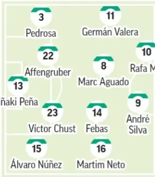 El once no debería presentar ninguna revolución, con la posible entrada de Chust al once si no se recupera Bigas y la duda de cómo completará la linea defensiva Sarabia, si repitiendo con Pedrosa u optando por otro perfil como Pétrot o Héctor Fort. En la medular, la duda se cierne otra jornada más sobre la figura de Rodrigu Mendoza, quien aguarda su oportunidad para volver al once.