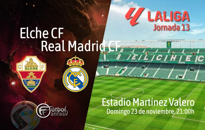 Elche y Real Madrid disputarán la jornada 13 de LaLiga este domingo 23 de noviembre de 2025, a las 21:00 horas, en el estadio Martínez Valero. Un duelo exigente para un Elche que busca frenar su mala racha frente al líder sólido que quiere seguir ampliando su ventaja. El conjunto ilicitano, dirigido por Eder Sarabia, llega en la 11ª posición tras una dinámica negativa, con tres derrotas y dos empates en sus últimos cinco encuentros. Los franjiverdes intentarán hacerse fuertes en casa para recuperar sensaciones y volver a sumar de tres. El Real Madrid de Xabi Alonso visita Elche como líder de LaLiga. Los blancos acumulan cuatro victorias y un empate en sus últimos cinco partidos, mostrando una regularidad que los mantiene en lo más alto de la tabla. Buscarán mantener su racha y seguir dominando la competición.