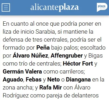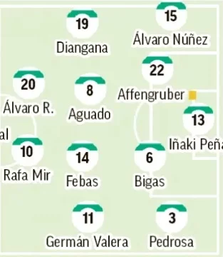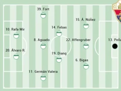 En cuanto al once titular, surgen varias dudas en algunas posiciones. Fort y Pedrosa se disputan una plaza, dependiendo de la ubicación de Germán Valera. Bigas apunta a sustituir al sancionado Víctor Chust y, en la medular, Mendoza o Martim Neto podrían dejar fuera a Diangana para cambiar el plan de partido. Arriba, Álvaro Rodríguez buscará la motivación del ex ante el conjunto azulón tras marcarle al equipo de su casa, el Real Madrid. La portería, una jornada más, es la gran duda.