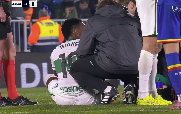 El mediapunta congoleño del Elche CF, Grady Diangana, que hoy repetía titularidad por segunda jornada consecutiva en el once de Éder Sarabia, tuvo que pedir el cambio en el minuto 45 del primer tiempo del partido de este viernes por la noche en el Coliseum, en el encuentro correspondiente a la jornada 14 de Liga. El técnico del conjunto franjiverde, tras comprobar que no pudo continuar, dio entrada a Rodrigo Mendoza en la reanudación para no agotar una ventana de cambios.