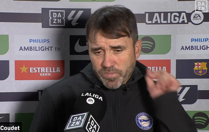 El técnico del Deportivo Alavés, Eduardo Coudet, atendió a los micrófonos de DAZN minutos antes del comienzo del partido que el conjunto babazorro disputará este sábado por la tarde contra el Barcelona en el Spotify Camp Nou, correspondiente a la jornada 14 de Liga. El entrenador argentino explicó su formación y el motivo de elegir a Calebe y Rebbach en los extremos.