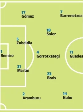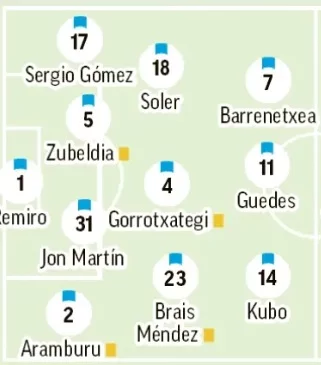 En cuanto al once titular, la principal duda radica en defensa, pues con Zubeldia recuperado y en convocatoria, vuelve a ser opción junto con Duje Caleta-Car y un Aritz Elustondo que no gustó en Mendizorroza. En el lateral izquirdo se siguen disputándose la plaza Sergio Gómez y Aihen, mientras que Barrenetxea debería volver al once según la lógica aplastante. Veremos si también según Sergio Francisco.
