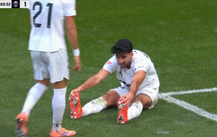 El defensor suizo del Valencia, Eray Cömert, se vio obligado a pedir el cambio en el minuto 70 del partido de este sábado por la tarde contra el Atlético de Madrid, en el Estadio Riyadh Air Metropolitano, correspondiente a la jornada 16 de Liga, debido a unos calambres en los isquiotibiales. La inactividad acumulada y el esfuerzo realizado en el partido de hoy, en el que inició por la baja de César Tàrrega, acabó pasándole factura y terminó siendo sustituido por Baptiste Santamaría con claros signos de fatiga muscular.