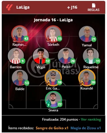 Kasumov alineó un once formado por Sivera; Koundé, Eric García, Balde; Riquelme, Pedri, Virgili, Barrios; Yamal, Sorloth y Raphinha. Entre las actuaciones más destacadas sobresalen los 22 puntos de Sivera con ítem, los 20, 18 y 13 de Koundé, Eric y Balde, los dos primeros con ítem. Los 20 de Pedri también marcaron distancias, al igual que los 43 de Raphinha y Sorloth, ambos con ítem y los 21 de Yamal. Además, el campeón de jornada recibió como recompensa otro ítem de Sangre de Giko y de Magia de Zizou, que podrá usar cuando lo crea conveniente.
