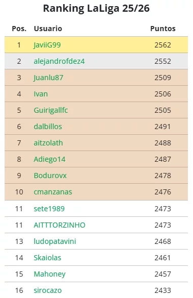 En cuanto al ranking general de LaLiga 25/26, el liderato se pone caliente con JaviiG99 manteniendo el liderato, con 2562 puntos. Muy de cerca le siguen alejandrofdez4 y Juanlu87 con 2552 y 2509 respectivamente. La pelea en la zona alta está más ajustada que nunca y promete emociones fuertes de cara a las próximas semanas.