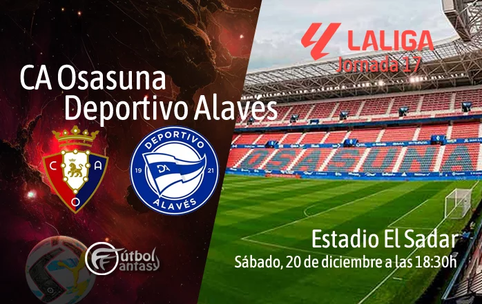 El Estadio El Sadar será el escenario que acoja este sábado 20 de diciembre de 2025 a las 18:30h el encuentro correspondiente a la jornada 17 entre Osasuna y Alavés. Ambos equipos llegan con la necesidad de mejorar sus resultados tras una serie de partidos irregulares. Osasuna, situado en la 16ª posición, acumula 3 derrotas, 1 victoria y 1 empate en sus últimos cinco encuentros, con la inyección de moral que supone pasar de ronda de Copa, mientras que Alavés, en la 13ª plaza, llega con 4 derrotas y una victoria en el mismo periodo, también con la clasificación para los octavos de final del torneo del KO asegurados.