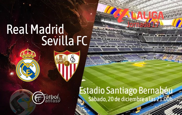 El Estadio Santiago Bernabéu acogerá este sábado 20 de diciembre de 2025 a las 21:00h un duelo clave de la jornada 17 entre Real Madrid y Sevilla. El conjunto blanco llega segundo en la tabla tras sumar 2 victorias, 2 empates y 1 derrota en sus últimos cinco partidos, además de clasificarse por la mínima para los octavos de final contra el Talavera de la Reina. Mientras que el Sevilla, situado en la 10ª posición, atraviesa un momento irregular con 2 derrotas, 1 empate y 2 victorias en sus últimos encuentros, sufriendo además la eliminación en el torneo del KO a manos del Deportivo Alavés.