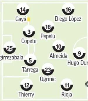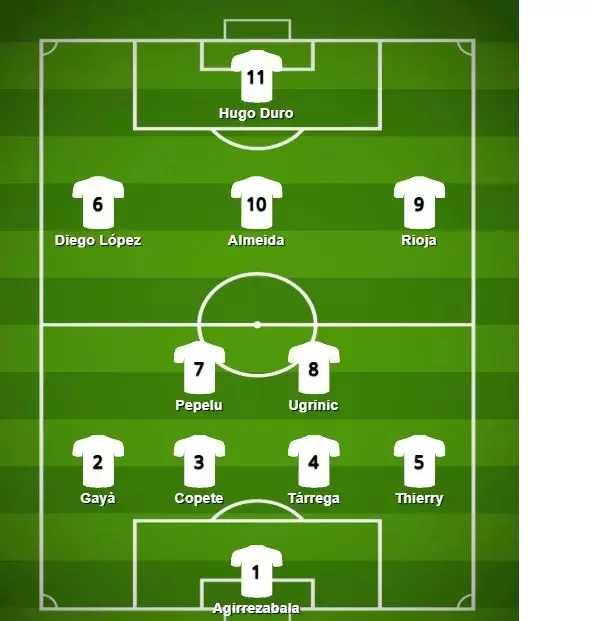 En cuanto al once titular, la gran duda estará en el sistema, pues tras los 45 minutos disputados de Diakhaby en Copa, Corberán podría decantarse por una defensa de cinco, teniendo además a Copete descansado. Gayà y Ugrinic también llegan con poco desgaste tras la Copa, al igual que Rioja, Almeida y Hugo Duro. Para completar el once el técnico de Cheste deberá decidir entre Diego López, que viene de ser titular en Liga y Copa o Beltrán, que viene de anotar dos goles en sus últimos dos partidos. Por lo probado el jueves por la tarde, parece que se decantará por el segundo.