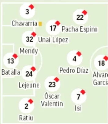 En cuanto al once titular, surgen dudas en la zona de tres cuartos y ataque, dependiendo de lo que busque Íñigo Perez en el plan de partido. El Pacha Espino, que actuó de extremo en la última jornada de Liga, se disputa la plaza con Pedro Díaz, desplazando a Isi y Álvaro García a las bandas. Si finalmente la opción es la de Fran Pérez, también podría verse amenazado Sergio Camello, siendo Álvaro García el delantero centro.