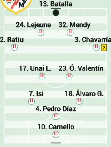 El Rayo afronta el partido con varias bajas y dudas. Jorge de Frutos y Diego Méndez son bajas confirmadas, el primero por lesión en la rodilla, aunqu en ya en la recta final y trabajando sobre el césped. En el capítulo de dudas se encuentran Alemao (molestias en el pubis), Abdul Mumin (recuperándose de la rotura de ligamento cruzado anterior sufrida hace 10 meses) e Iván Balliu (lesión en los isquiotibiales); los tres continúan con sus respectivos procesos de recuperación al margen del grupo.