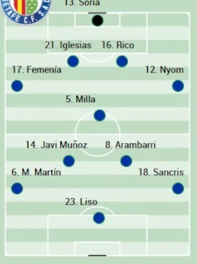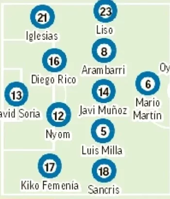 El once se presentará con un acertijo en defensa, sobre todo si no llega a tiempo Abqar. Iglesias y Diego Rico pueden ocupar los flancos derecho e izquierdo de la linea de tres, con Femenía y Nyom en los carriles, pero el líbero deberá salir de entre Abqar, si se recupera, Neyou, readaptado a la defensa o el canterano Laso, quien ya jugó varios partidos de Copa. En zona de tres cuartos, Juanmi y Sancris amenazan las opciones de Javi Muñoz y Mario Martín, con opciones también para Coba.