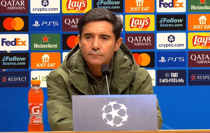 “Son competiciones diferentes. Por supuesto, darle mi parte la enhorabuena a Pape Gueye, porque además de ganar su país, su selección, ha sido partícipe de forma decisiva en la consecución del título, con dos goles anteriormente y con el gol definitivo en el partido de ayer. Y también transmitirle a Ilias Akhomach la enhorabuena por ser partícipe de la Copa de África, por jugar y participar en la final, aunque juegan dos. Es imposible que ganen los dos. Gana uno y, en este caso, le ha tocado a Senegal. No sabría decirte si llega para este partido, yo creo que no. Pape Gueye, aunque no estuviera sancionado, tiene que celebrarlo hecho. Y luego, al ser competiciones diferentes, no tiene por qué afectarnos. Además, creo que contra el Betis perdimos, pero no jugamos un mal partido. Siempre se pueden hacer las cosas mejor, pero creo que estuvimos a un nivel muy similar y que la contundencia en las áreas fue la que decidió el partido para ellos. Pero creo que jugamos a un muy buen nivel competitivo. Nos faltó quizás un poco de precisión y, sobre todo, acierto en el último pase, donde tuvimos opciones bastante claras para haber marcado, pero no lo hicimos y el rival sí que lo hizo, sobre todo hablando hasta la expulsión de Santi Comesaña, que sí que me parece que resultó decisiva para el resultado final. Entonces, no tenemos por qué preocuparnos para nada y, como te decía, también son competiciones diferentes y ahora pensar en la Champions y ganar el partido. Pondremos todo de nuestra parte para hacerlo.”