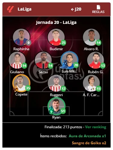 El Fantasy RPG de FútbolFantasy ya tiene al vencedor de la jornada 20 de LaLiga. El usuario dieman95 se ha proclamado campeón con un total de 213 puntos, gracias a una alineación repleta de aciertos.