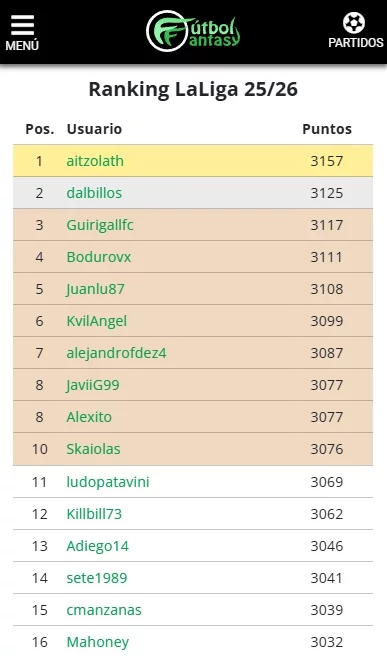En cuanto al ranking general de LaLiga 25/26, el liderato se pone caliente con Aitzolath asaltando el liderato, con 3157 puntos. Muy de cerca le siguen dalbillos y Guirigall, con 3125 y 3117 puntos respectivamente. La pelea en la zona alta está más ajustada que nunca y promete emociones fuertes de cara a las próximas semanas.