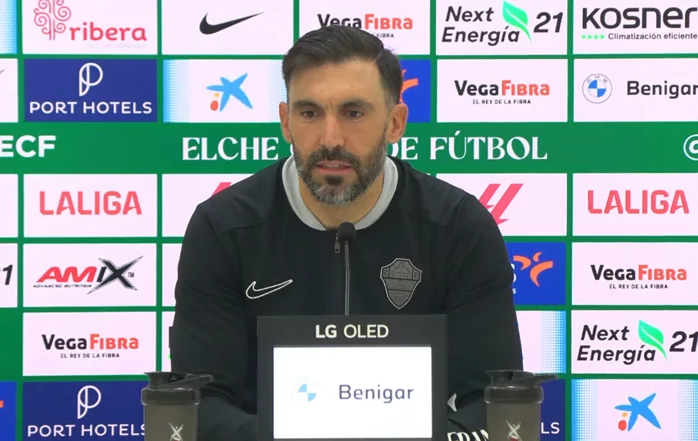 “A ver, no porque quedan muchísimos puntos. Y repito, porque creo que hemos sido capaces, incluso te diría también merecedores seguramente, de más de lo que tenemos. Y creo que a nivel rendimiento... A ver, es que claro, por ejemplo, empezamos este año y vemos los rivales que hemos tenido. Y me parece muy bien y me gusta que nos comparemos y que el nivel de exigencia sea tan alto que entendamos que es decepcionante que nos gane el Villarreal aquí, que nos elimine el Betis allí, que no le ganemos al Valencia y que no le ganemos al Sevilla. Pero claro, si analizamos esos cuatro equipazos, su historia reciente en el fútbol español y todo lo que supone, pues seguramente lo extraordinario es haber sido superior al Villarreal durante mucho tiempo. Y es verdad que después de un mal inicio seguramente si nos vamos al descanso 2-2 será lo más justo y ahí el partido habría sido diferente. Creo que contra el Valencia el equipo no hace un buen partido, pero da la cara y al final empatan por un penalti, que es penalti, pero que es como es, así de circunstancial. En Sevilla creo que fuimos muy superiores al Betis, salvo 15 minutos, con los condicionantes que tuvo el partido. Y el otro día nos lamentamos porque nos empaten a dos y porque no sé qué y no sé cuántos. Pero claro, tampoco valoramos que nos hemos puesto 2-0 a favor contra el Sevilla y el equipo que es el Sevilla y todo eso. Al final creo que hemos puesto el listón tan alto en muchas cosas que a veces perdemos un poco esa perspectiva. Que es verdad que sigue estando todo muy apretado, que ahora es verdad que estamos en la cabeza y estamos octavos en la cabeza de ese pelotón que perseguimos a los de arriba. Que tenemos grandísimos equipos por detrás, que es verdad que en dos partidos esto puede cambiar. Nada es definitivo, lo que me transmite tranquilidad es el rendimiento en general del equipo durante gran parte de los partidos. Y que hay momentos que nos está costando manejar, que hay momentos que nos están costando puntos, pues sí. Igual no seríamos el Elche y seríamos otro equipo, ¿no? Por eso digo, me gusta más valorar todo lo bueno que estamos haciendo que ponerle tanto el foco ahora mismo, por ejemplo, en lo que nos falta. Que hacia adentro, como ya sabéis, soy el primero que aprieta, que exige, que va al detalle, que analiza el primer gol del otro día. Y que va a que nuestro principal objetivo es ser cada día mejores y para eso todavía nos falta, todavía nos falta, evidentemente. Y que también ha coincidido un calendario un poco apretado, dos semanas en las que, como ya dije el otro día, no estamos pudiendo trabajar demasiado en campo. Y que me apetece ya también tener semanas un poco limpias porque los equipos que no somos grandes, grandes y que estamos acostumbrados a jugar domingo, miércoles y demás, pues eso nos pesa. Entonces, bueno, ahora tenemos que prepararnos de otra manera y a partir del lunes que viene, pues enfocarnos en recuperar ciertas cosas. En eso que sabemos que todavía tenemos margen de mejora, ponerle el foco y, como digo, seguir creciendo como equipo. Pero, evidentemente, porque ser un equipo redondo es dificilísimo y más en primera división y más con nuestras circunstancias. Pero, evidentemente, estoy tremendamente contento y tremendamente agradecido.”