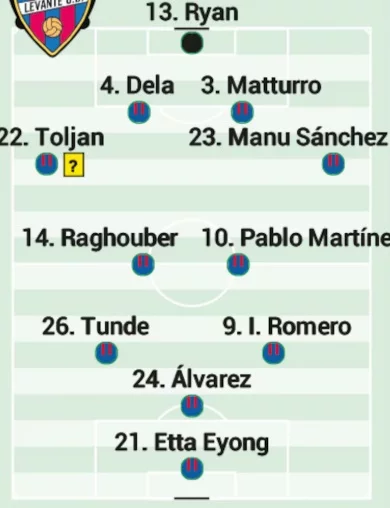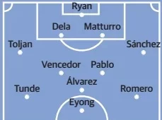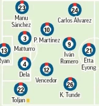 En cuanto al once titular, habrá que ver si finalmente llega para jugar Matías Moreno o repetirá una jornada más Alan Matturro. En la medular, Raghouber espera su turno en caso de que Arriaga tampoco llegue en condiciones. Arriba, Losada aparece como opción para completar el ataque tras ser suplente en el Bernabéu, ya sea por Tunde o por un Etta Eyong que no estuvo a su mejor nivel en Madrid.