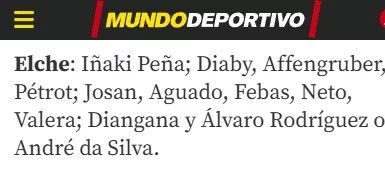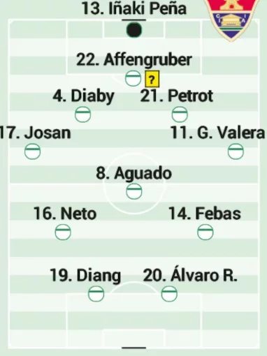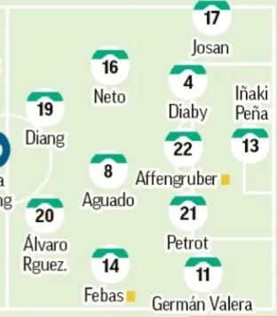 La alineación inicial del técnico franjiverde tiene las dudas físicas de Núñez, Bigas y John, que condicionan la confección de la defensa. En caso de no llegar ninguno de ellos, Petrot y Bambo acompañarán a Affengruber. En el carril opuesto al de Valera se disputan la plaza Josan y Pedrosa. Arriba, Diangana, Yago Santiago y André Silva luchan por un puesto en el once. Peña y Dituro siguen con su particular batalla bajo palos.