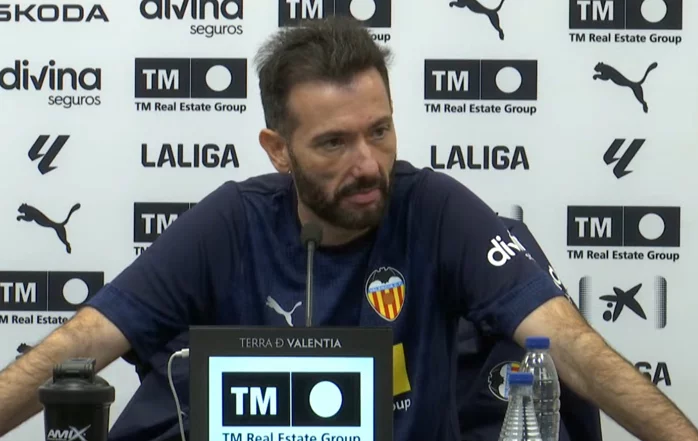 "Bueno, esperamos un partido, como he dicho antes, exigente y nosotros tenemos muchísimas ganas, después de haber jugado fuera de casa en Getafe, el partido anterior fuera de casa también que fue el rival contra el Burgos, muchas ganas de volver al Mestalla, sabemos lo importante que es nuestro campo, nuestra afición y con ganas mañana de combatir ante un gran rival que está haciendo las cosas, como he dicho, extraordinariamente bien y con ganas de, ante nuestra afición, demostrar lo mucho que queremos mejorar las cosas."