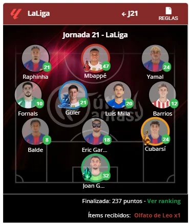 dieman95 alineó un once formado por Joan García; Cubarsí, Eric García, Balde; Barrios, Luis Milla, Güler, Fornals; Yamal, Mbappé, Raphinha. Entre las actuaciones más destacadas sobresalen los 32 puntos de Joan García con ítem, los 24 con Cubarsí, también con ítem, los 18 de Eric García, 20 de Luis Milla, 21 de Arda Güler con ítem y, como no, el tridente goleador: Yamal, Raphinha y Mbappé, con un ítem para el astro francés. Además, el campeón de jornada recibió como recompensa otro ítem de Olfato de Leo.