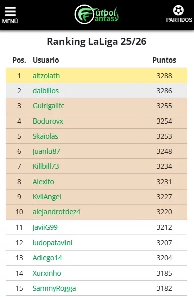 En cuanto al ranking general de LaLiga 25/26, el liderato se pone caliente con Aitzolath asaltando el liderato, con 3288 puntos. Muy de cerca le siguen dalbillos y Guirigall, con 3286 y 3255 puntos respectivamente. La pelea en la zona alta está más ajustada que nunca y promete emociones fuertes de cara a las próximas semanas.