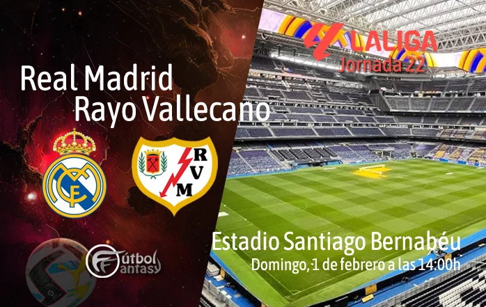 Real Madrid y Rayo Vallecano se medirán este domingo 1 de febrero de 2026, a las 14:00 horas, en el Estadio Santiago Bernabéu, en un encuentro correspondiente a la jornada 22 de Liga. El conjunto blanco llega como segundo clasificado tras encadenar cinco victorias consecutivas en sus últimos cinco partidos, con la misión de seguir apretando al líder, el Barcelona. Mientras que el Rayo, situado en la 16ª posición, afronta el duelo tras un balance de 3 derrotas, 1 victoria y 1 empate en el mismo periodo, con la intención de sumar puntos que le alejen de la zona baja.