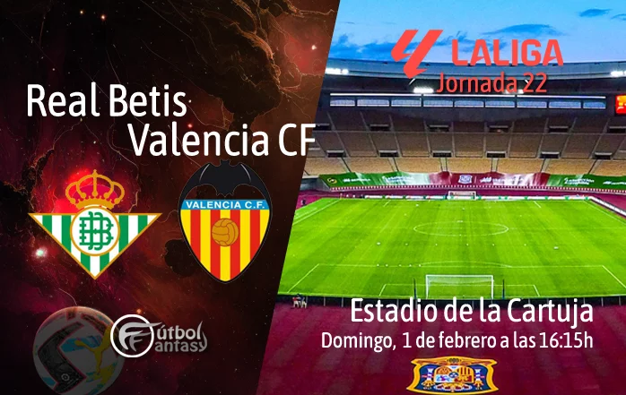 Betis y Valencia se enfrentarán este domingo 1 de febrero de 2026, a partir de las 16:15 horas, en el Estadio de La Cartuja, en un encuentro correspondiente a la jornada 22 de Liga. El equipo verdiblanco, dirigido por Manuel Pellegrini, llega a la cita situado en la 6ª posición tras sumar 2 victorias, 1 empate y 2 derrotas en sus últimos cinco partidos, con la misión de seguir defendiendo una plaza europea. Por su parte, el Valencia ocupa la 14ª plaza con un balance de 2 victorias, 2 empates y 1 derrota en el mismo periodo, buscando sumar para alejarse de la zona baja y seguir con las buenas sensaciones de las últimas fechas.