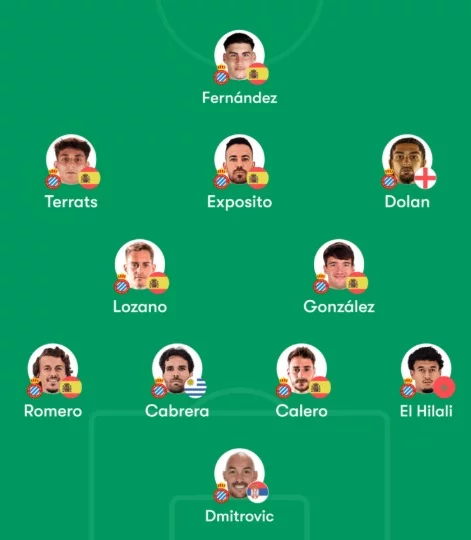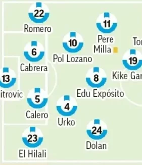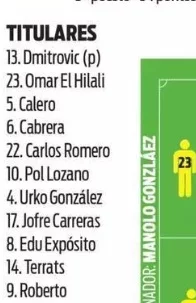 El once, debido a los últimos resultados, empieza a tambalearse en varias posiciones y algunos jugadores importantes están en peligro de salir del once titular. En defensa volverá El Hilali, tras cumplir un partido de sanción y todo apunta a que Edu Expósito regresará tras ser suplente en Mestalla y cuajar buenos minutos como revulsivo. Lozano y Pere Milla podrían ser los sacrificados en un posible cambio de sistema en el que Kike García podría tener protagonismo ante su ex equipo.